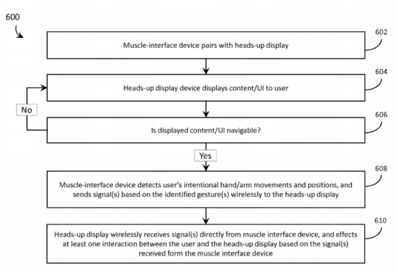 专利描述的完全可穿戴系统包括可穿戴肌肉接口设备和可穿戴头戴式显示器,以及使用可穿戴系统来影响用户与显示内容交互的方法。可穿戴肌肉接口设备包括佩戴在用户手臂的肌肉活动传感器,其用于检测当用户执行物理手势时产生的肌肉活动。可穿戴系统用于识别用户所做的多个手势,并且响应于每一个识别手势实现一个或多个与显示内容的交互。