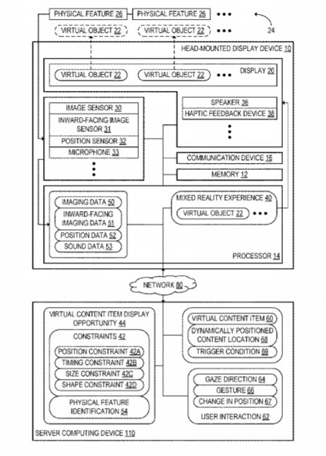 专利描述的头戴式显示设备包括显示器、包括一个或多个图像传感器的一个或多个输入组件、一个或多个通信设备和处理器。处理器可以输出用于显示包括一个或多个虚拟对象的混合现实体验。处理器可以向服务器计算设备发送成像数据。处理器可以从服务器计算设备接收虚拟内容项显示机会的标识。处理器可以根据所述标识向服务器计算设备发送一个或多个虚拟内容项的请求。处理器可以从服务器计算设备接收一个或多个虚拟内容项,并且可以输出一个或多个虚拟内容项以供显示。