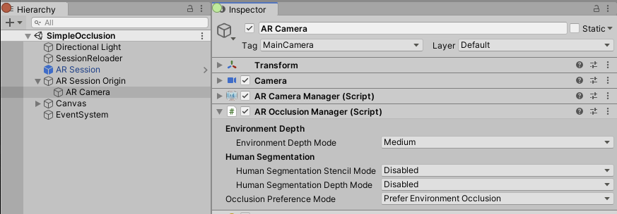 Unity已经扩展了AR Foundatin对透视视频的现有支持,将ARCore提供的每像素深度信息纳入在内,从而允许兼容设备轻松实现遮挡效果。通过简单地将AR Occlusion Magager添加到保有AR Camera和AR Background Rendenre组件的同一个GameObject中,着色器会自动计算深度数据并创建这种融合效果。