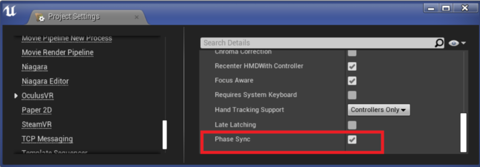 要在UE4中启用,请通过GitHub下载UE4.25,然后选中Project Settings->OculusVR下的“Phase Sync”复选框。