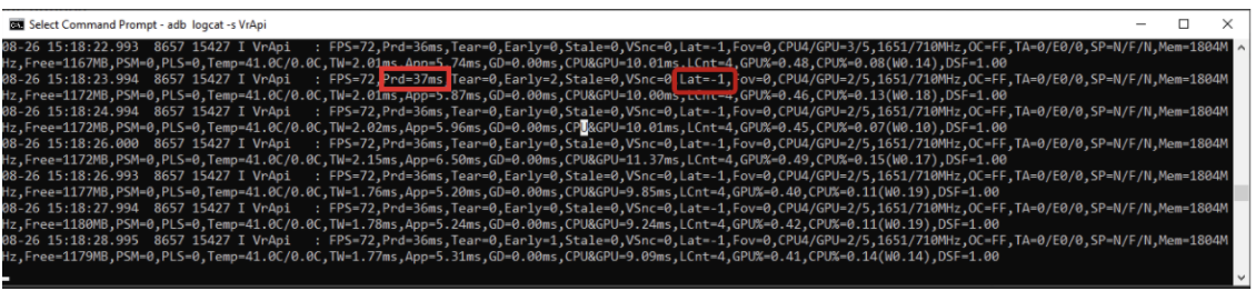 一旦应用成功地启用Phase Sync(相位同步),你可以通过运行“adb logcat-s VrApi”来予以确认。你应该会看到一个标记为“Lat=-1”的组件,这意味着延迟是由Phase Sync(相位同步)动态管理。在固定延迟模式下,非Phase Sync(相位同步)下的值将为“Lat=1”(额外延迟模式)或“Lat=0”(非额外延迟模式)。