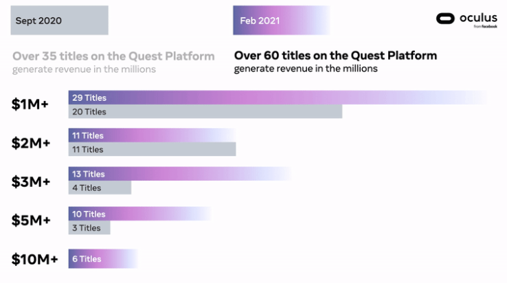 在Facebook Connect大会,我们同时分享了Quest平台已有超过35款游戏已经创造了数百万美元的营收。大约四个半月后,这一数字已经超过了60款,几乎是数月前的两倍。我们可以用另一种说法,每三款付费内容就有一款在营收方面超过100万美元。各种规模的开发者都看到了Quest平台带来了有意义的营收增长,而这在很大程度上要归功于Quest 2的技术性能和突破性的无线形态。