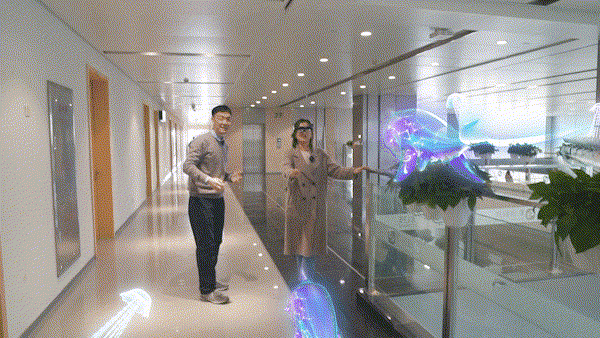 这个时候,伸出手触碰一下正在游动的鲲,它会有360度的旋转跳跃哦!虽然在真实的水族馆里我们触摸不到这些珍稀动物,但现在,可以通过影创MR眼镜,在虚拟世界里与小动物们进行亲密互动。