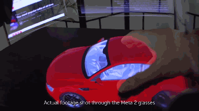 说到Meta,说它是第一款真正意义上的增强现实(AR)设备并不为过,可惜最终结局却令人唏嘘。Meta眼镜里内置了一台爱普生微型3D投影仪,可将虚拟画面投射到镜片上。同时眼镜上方放置了3D摄像头,能够捕捉用户的手势,根据手势做出操控反应,精确度可精确至手指,可以直接通过手势如抓握,来控制眼前的3D模型。此后,Meta又开发出了一些新手势的识别,包括点击、双手旋转、扩大和缩小,但似乎主要是针对3D图形的创建和编辑工具。