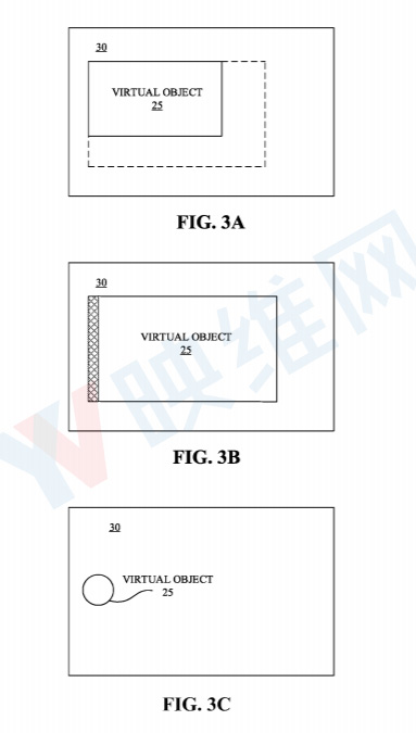 如图3C所示,在另一实现中,调整虚拟对象#25的显示特性(如状态或表示)。例如,虚拟电视可以从屏幕变为图标或应用徽标。例如,虚拟对象#25的状态可以随着接近视场#30的一个或多个边缘而改变。