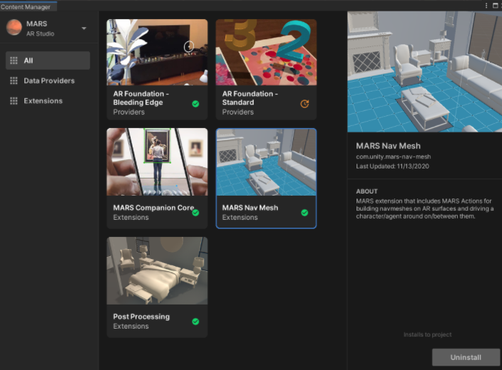 安装完Unity MARS后,你会在Unity的主菜单中看到内容中心。请依次转到Window窗口-> Content Manager内容管理器。
