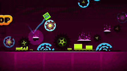 画风方面使用了饱和度较高的荧光绿、荧光蓝、荧光紫,在风格上也做了萌化处理,比如小怪的表情使用了偏二次元的颜文字,配合节奏感强的电子音乐,整体呈现出比较活泼明快的氛围。这种画风的好处是比较讨喜,很难像漫画《JOJO的奇妙冒险》那样,个人风格突出,让一部分玩家完全接受不了。用简单的荧光线条突出科技感的美术理念在一些音游,比如《几何冲刺》等上也多有运用。