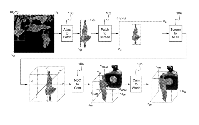 专利描述了用于3D对象和3D场景的统一编码的方法。camera模型用于捕捉一个三维对象的一部分或一个三维场景的多个视图。camera模型作为元数据传输,捕获的三维元素组合在一个2D atlas图像中,并能够通过2D视频编码器进一步压缩。通过camera模型的灵活信令,编码器能够将多种不同类型的内容压缩成单个比特流。