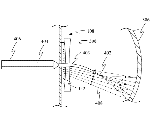 专利描述的眼镜设备包括光学扫描系统,光学扫描系统至少部分地通过眼镜目镜中的开口突出。光学扫描系统包括延伸穿过开口的光纤或悬臂梁,以及驱动光纤或悬臂梁以螺旋模式移动的换能器。