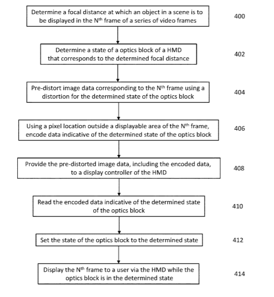 专利描述的方法包括提供用于由头戴式显示器显示的视频数据帧。像素数据编码在至少一些视频数据帧的像素中,所编码的像素数据定义用于向用户显示视频数据的相应帧的光学模块的焦点状态。根据光学模块的多个可用焦点状态确定预定焦点状态,每个焦点状态对应于基于视频数据生成的虚拟图像的不同焦平面。用于编码的像素可以布置在可由头显显示的帧的区域之外。
