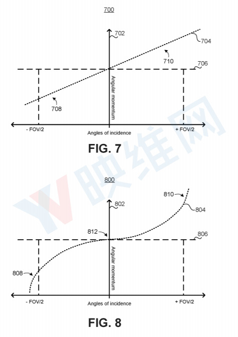 图7和图8描述了用以实现图像压缩和扩展的动量处理。图7是线性动量处理,而图8是非线性动量处理。其中,图7和图8中的706和806是标准光栅的扩散线,而704和804是专利描述的超表面线性扩散线和非线性扩散线。