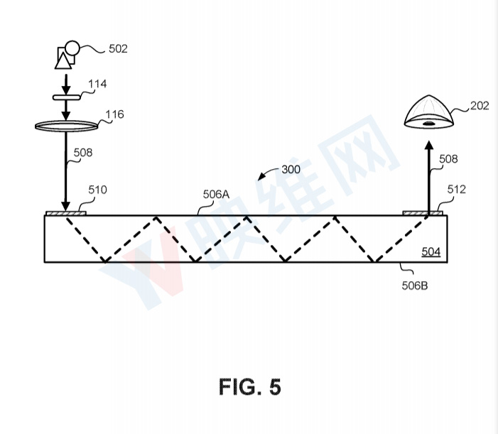 如图所示,波导#300可包括透射基板#504,后者具有表面#506A和表面#506B。表面#506A和表面#506B可基本彼此平行且可为内反射,从而为在透射基板#504内传播的光波#508提供TIR全内反射。