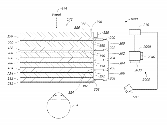 专利描述的头戴式显示器用于呈现看起来位于用户周围环境中的3D虚拟对象。头显和用户眼睛的相对位置可能不在接收或注册头显输出的图像信息的期望位置。例如,头显到眼睛的对准针对不同的用户而变化,并且可以随时间而改变。系统可确定头显和用户眼睛之间的相对位置或对准。根据相对位置,系统可确定体验是否适当地匹配用户,可向用户提供关于匹配质量的反馈,并可采取措施以减少或最小化任何未对准的影响。