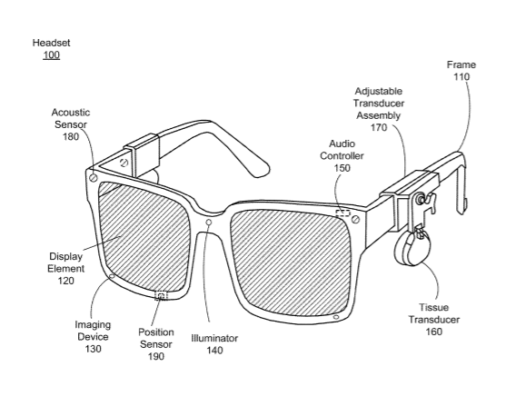 专利描述的头显包括位于托架上的组织换能器。托架配置成接触用户耳根。耳根提供参考点,并且当托架与耳根接触时,组织换能器配置成位于目标区域中。通过保持组织换能器相对于用户耳根的固定位置,组织换能器可以精确地实现定位。
