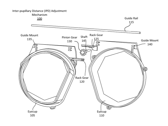 专利描述的IPD调节机制包括用于每个光学组件的臂和与臂连接的齿轮。在一个实施例中,每个臂是与小齿轮连接的齿条齿轮。每个眼杯安装在一个或多个轨道上,以便调整眼杯之间的距离。相应地,齿轮的移动使得两个眼杯彼此远离或朝向彼此移动。在一些实施例中,IPD调节机制由电机驱动。在一些实施例中,IPD调整机制由用户手动控制。