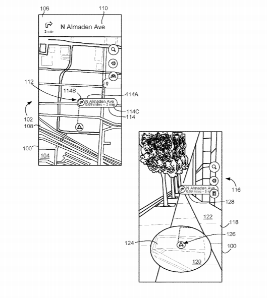 专利描述的方法包括:在处于地图模式的设备触发地图的至少一部分的呈现,其中第一关注点(POI)对象放置在地图上,第一POI对象表示位于第一物理位置的第一POI;在呈现地图的同时检测,触发设备从地图模式转换到增强现实模式的输入;触发AR模式下AR视图的呈现,AR视图包括由设备摄相头捕获的图像;确定第一POI的第一物理位置是否在图像视场之内;如果在视场之内,则触发在AR视图的第一边缘处放置第一POI对象。