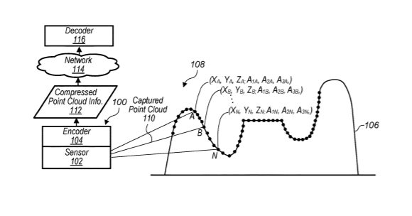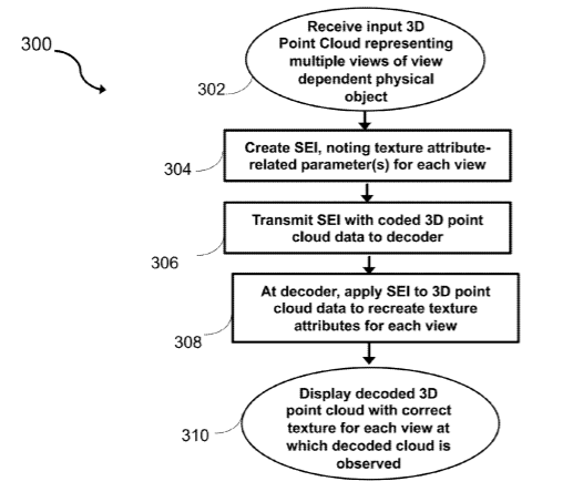 专利描述了一种用于在传输和解码之前对3D点云中的点的视点相关纹理属性进行编码的方法。所述方法包括,在传输和解码之前为3D点云创建补充SIE消息。SEI消息包括与3D点云中在初始时刻的多个观看状态的各个点的纹理属性相关的参数,使得在解码器接收SIE消息时,解码器能够使用所述消息对纹理属性进行分类,并将一个或多个纹理属性应用于各个点,以便解码的3D点云中的每个单独点的纹理在对每个点的传输和解码之前是正确表示的查看状态。