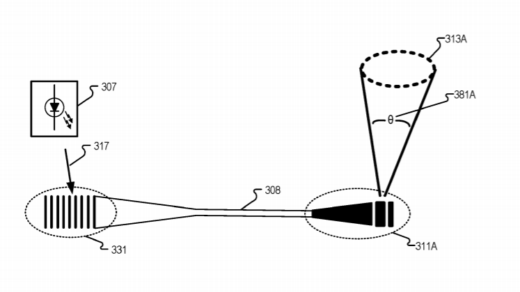 专利描述的光学元件包括透明层、耦出元件和波导结构。所述耦出元件跨所述透明层定位。所述波导结构向所述耦出元件提供不可见光,所述耦出元件将所述不可见光作为不可见照明光进行耦出,以照明眼睛区域。