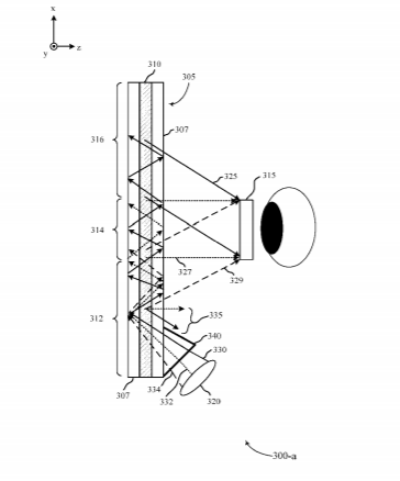 专利描述的多程扫描仪包括光源、可倾斜反射器和多程耦合器,多程耦合器将光源发射的光耦合到可倾斜反射器,接收反射光并将其耦合回可倾斜反射器,从而使扫描角度加倍。然后,多程耦合器将从可倾斜反射器反射至少两次的光耦合到扫描器的光瞳。设置在扫描器光瞳的光瞳复制波导在角域中延伸图像。