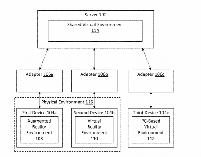 用于维护共享交互环境的系统和方法包括,由服务器接收向共享交互环境注册第一用户的第一输入设备,及第二用户的第二输入设备的请求。第一输入设备可以用于针对AR环境的用户输入的第一模态,并且第二输入设备可以用于针对虚拟现实环境的用户输入的第二模态。服务器可以向共享交互环境注册第一和第二输入设备。服务器可以从用于第一模态的第一适配器和用于第二模态的第二适配器接收输入。所述输入可供第一和第二用户使用共享交互环境。