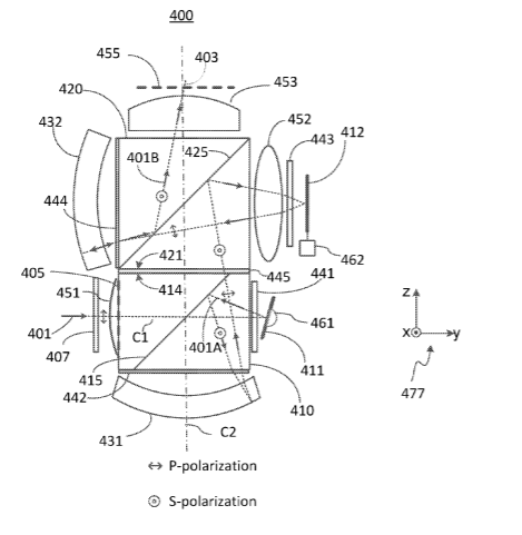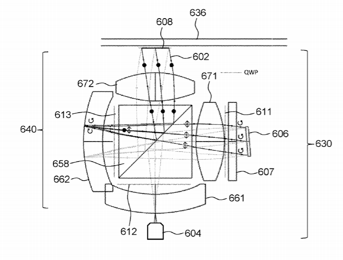 专利描述的扫描投影仪包括配置成在第一平面中引导光束第一扫描反射器,配置成在第二平面中引导从第一扫描反射器接收的光束的第二扫描反射器,以及光束中继光学器件。光束中继光学器件配置成将在第一扫描反射器定义的第一光瞳中继到在第二扫描反射器定义的第二光瞳,并且将第二光瞳中继到扫描投影仪的输出光瞳。光束中继光学器件可以包括凹面反射器和耦合到扫描反射器的偏振分束器。