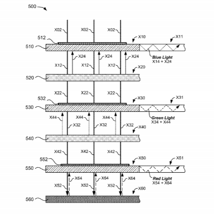 专利所述的目镜包括位于第一横向平面的第一平面波导,位于与第一横向平面相邻的第二横向平面中的第二平面波导,以及位于 与第二横向平面相邻的第三横向平面中的第三平面波导。第一波导包括与其耦合并设置在横向位置的第一衍射光学元件(DOE)。第二波导包括与其耦合并设置在横向位置的第二DOE。第三波导包括与其耦合并设置在横向位置的第三DOE。目镜同时包括位于第一波导和第二波导之间的第一滤光器,以及位于第二波导和第三波导之间的第二滤光器。