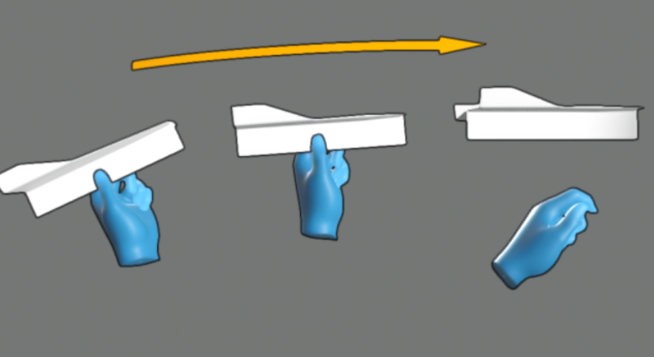 纸飞机是一个有趣的投掷情况。尽管依然存在投掷对象时的一些缺点(有时候,投掷姿态和实际投掷之间存在延迟),但我们发现,玩家常常做出的投掷姿态相当契合头显的追踪边界。
