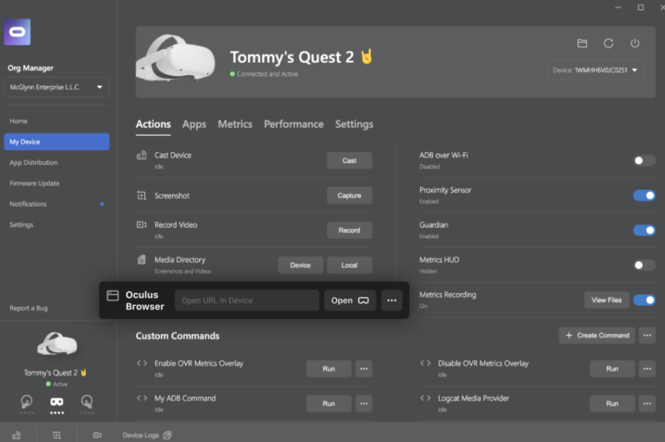 现在你可以在ODH中输入一个URL,并在Oculus Browser中快速启动。依次导航“My Device”>“Actions”,然后在Oculus Browser字样旁边输入一个URL,再单击“Open”。这项功能适用于任何URL,并且是启动你正在开发的