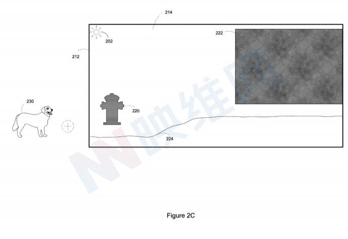 如图2C中所示,头显正在将数字狗狗#230添加到半透明显示器#214中,如加号所示。数字狗狗狗为白色。所以,一旦添加到半透明显示器中,数字狗狗的优选显示颜色将同样为白色。