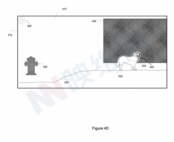 转到专利图4D上面,#420是根据发明所述方法调整后的效果。其中,头显可以感测与物理环境光相关联的多个光叠加特征值,然后头显可以对区域#420着色,例如降低与区域#420相对应的蓝色墙壁亮度。所以如图4D所示,加在半透明显示器的数字狗狗将是理想的白色,因为蓝色墙壁反射的蓝光强度降低了。