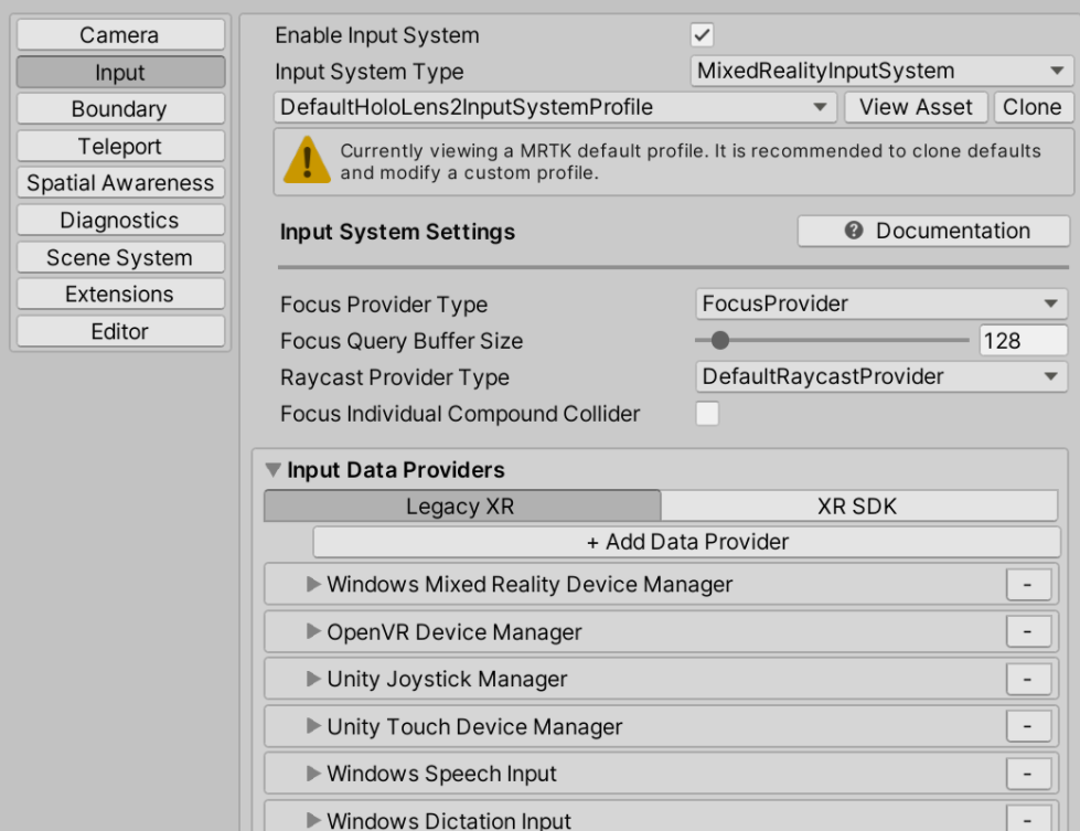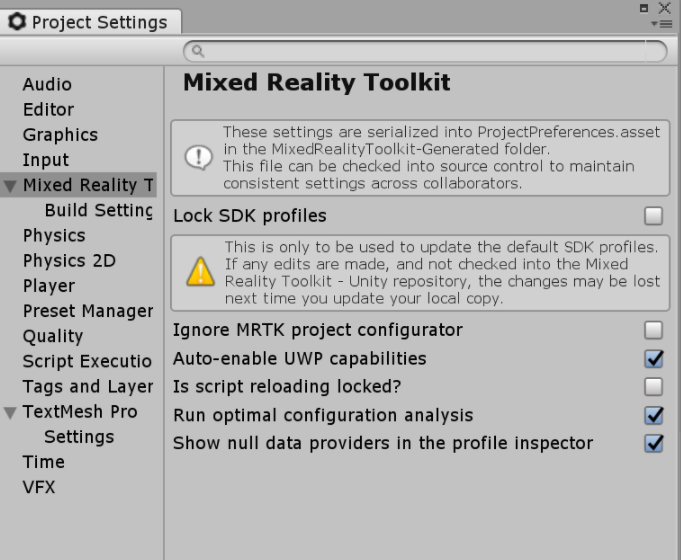Null Data Provider现在将不再加载和显示在配置文件检查器中。用户可以依次导航“Edit”->“Project Settings”->“Mixed Reality Toolkit”,然后切换“Show null data providers in the profile inspector”,从而通过Missing Data Provider调试意外行为。