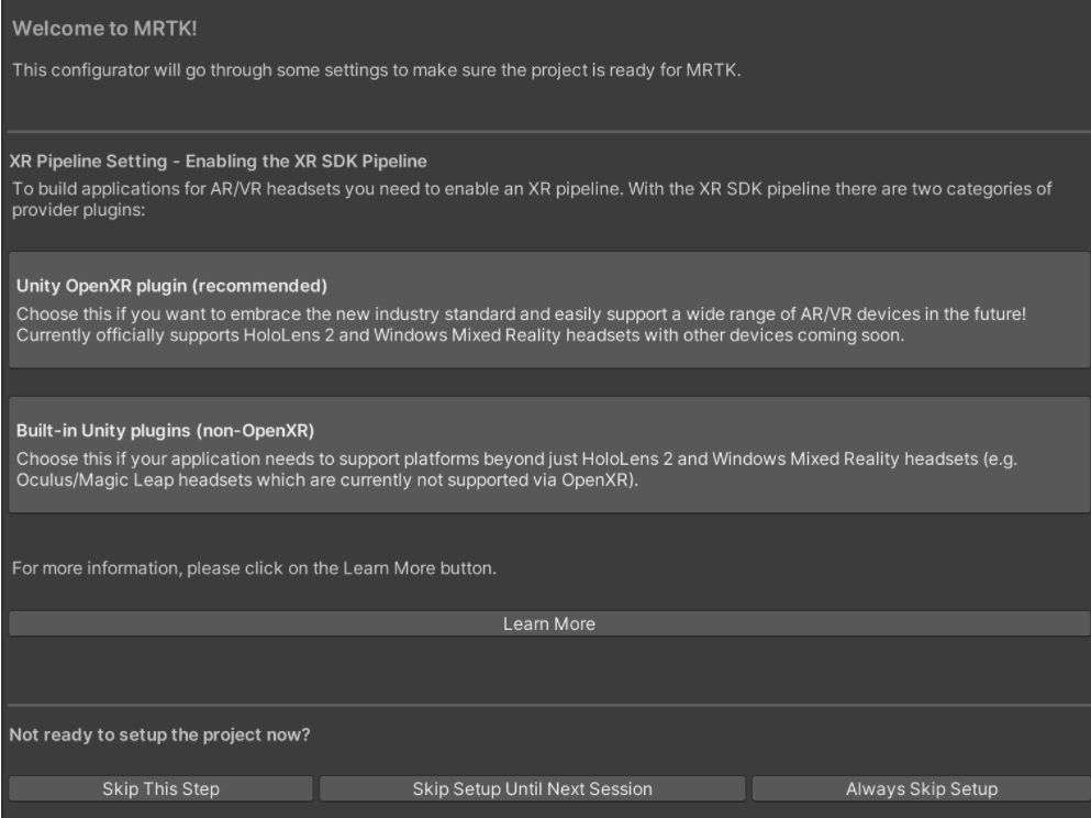 新的MRTK配置程序为用户提供了分步指导,包括选择XR管道、获取特定于平台的插件、导入TextMeshPro、显示示例(使用UPM时)以及建议设置。