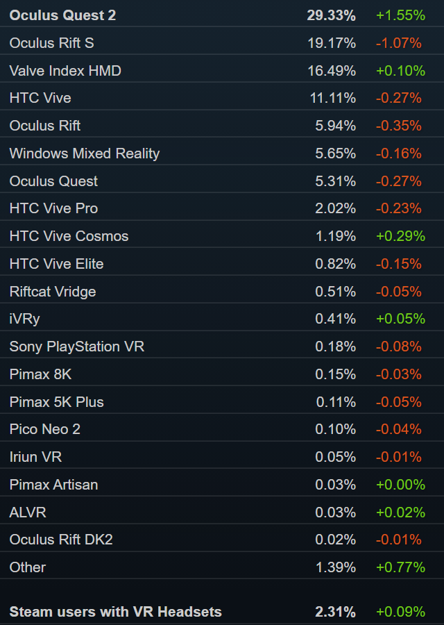 硬件和软件调查”。数据显示,Steam平台月活VR头显用户总占比增长到了2.31%,较上月增长0.09%,达到历史最高。在头显占比方面,