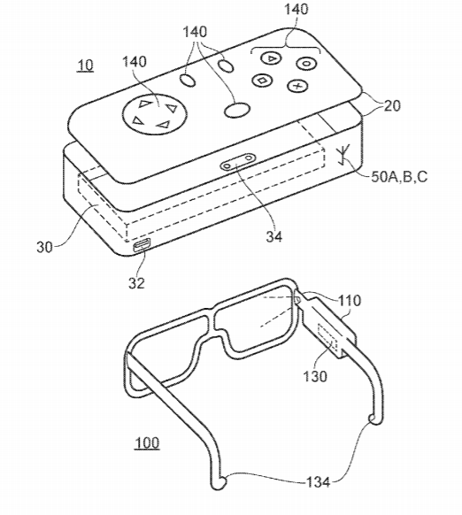 专利描述了一种用于一对眼镜的眼镜盒。眼镜盒包括一个外壳,其中外壳具有可以存储眼镜的体积。眼睛盒同时包括耦合到电源接入单元的电池。当眼镜存储在外壳中时,其可从电源接入单元吸取电源。眼镜盒同时包括以类似于传统游戏控制器配置布置的用户控制输入配置,其用于向驱动眼镜显示器的计算系统提供输入。