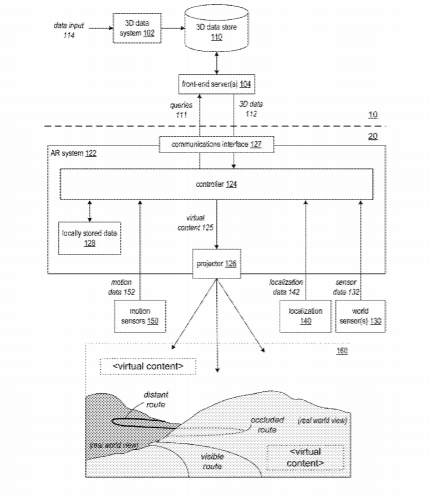 专利描述的AR系统利用预先生成的世界3D模型来改进AR视图中的3D图形内容呈现,例如移动车辆的前方世界AR视图。AR系统可以从远程源(如基于云端的存储)获得预生成的3D数据,并且可以使用预生成的3D数据(如3D网格、纹理和其他几何信息的组合)来增强本地数据。