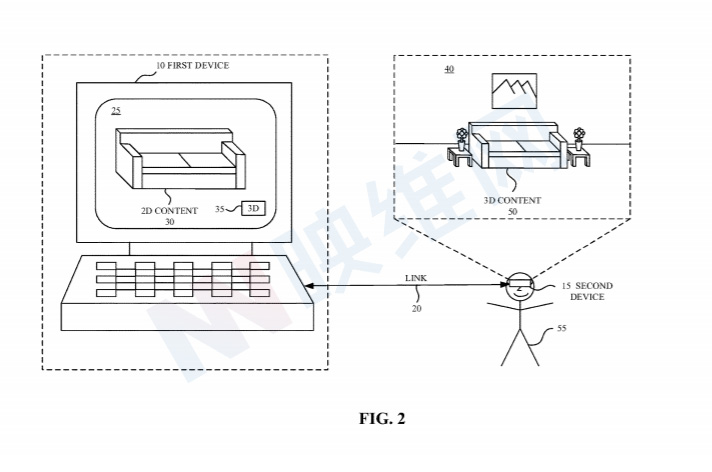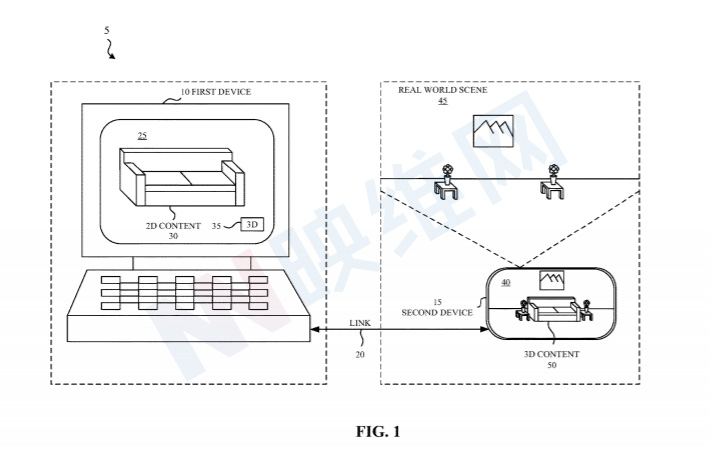 在一个简单的示例中,用户可以通过PC浏览2D网页内容,比如网购沙发。若2D网页的沙发提供3D模型,PC可以与智能手机或头显通信,并允许用户通过智能手机或头显可视化所述沙发摆设在家中的效果,如上面的专利图所示。