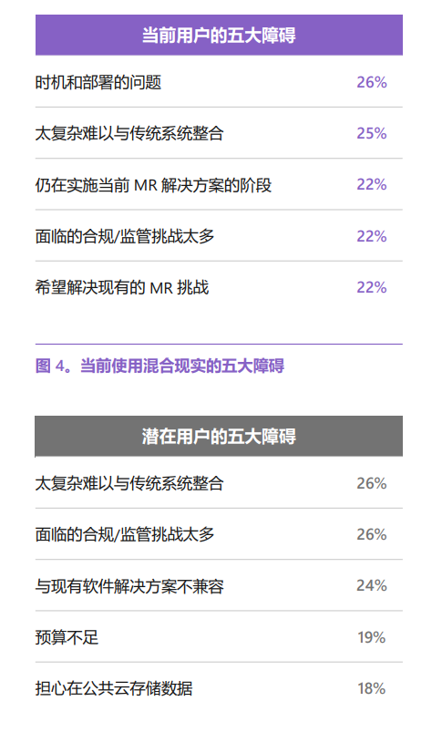 尽管MR已经越发普及,而且存在一系列的优点,但这项技术在普及方面依然存在挑战。根据调查,时机和部署问题都是当前用户和潜在用户的首要障碍。另外,由于医疗健康领域的监管流程复杂,合规问题同样是阻碍混合现实普及的重要障碍。