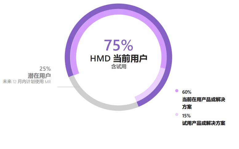 在医疗健康领域,目前约有四分之三的组织通过头显使用混合现实解决方案。其中,60%正在使用混合现实产品或解决方案,15%则是在试用相关产品或解决方案。医疗健康行业的大多数混合现实用户认为自己处于采用该技术的相对早期阶段,约62%采用所述技术不足两年。