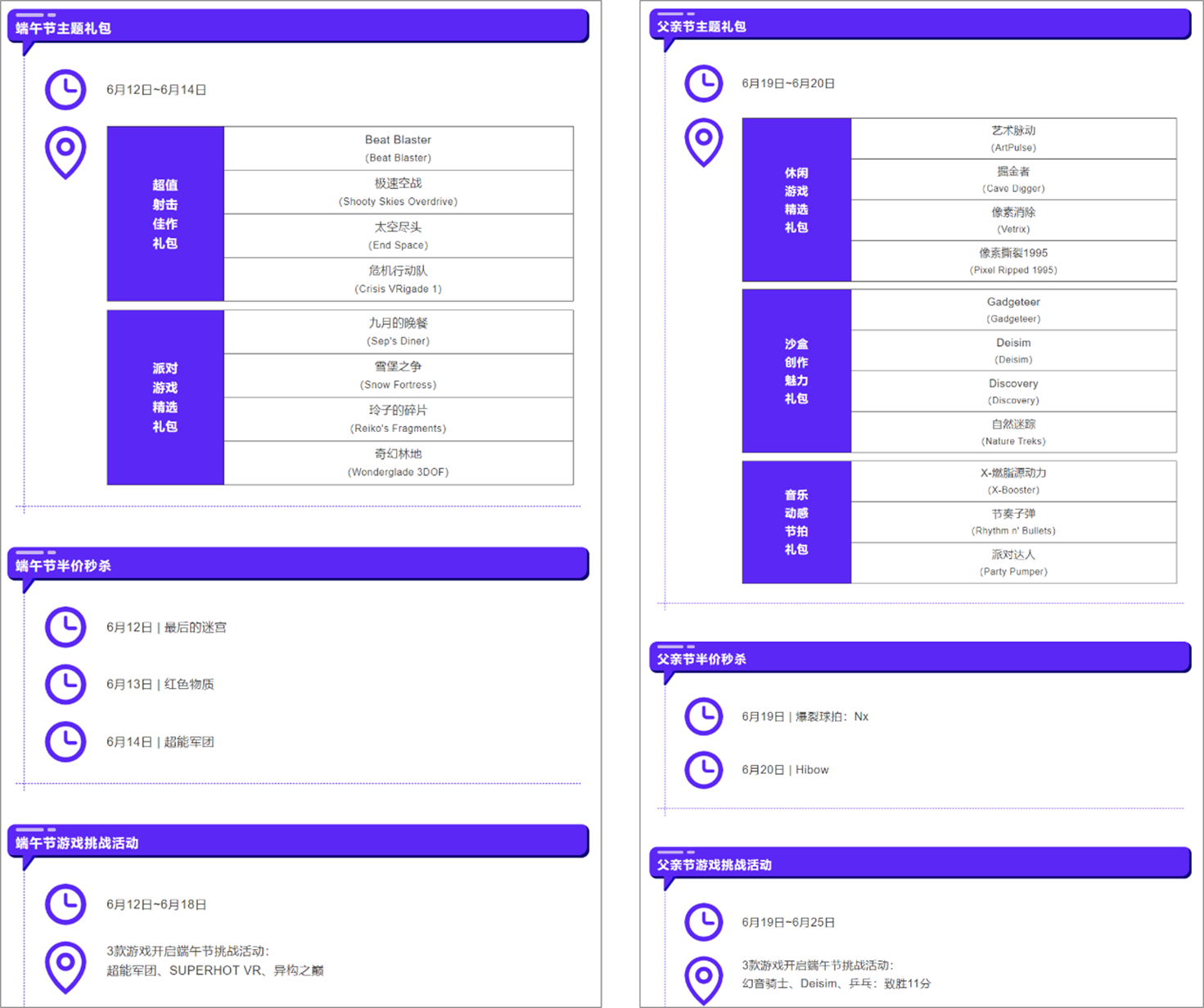 端午节(6/12-6/14)及父亲节(6/19-6/20)期间,Pico Store还将上线端午节日限时捆绑包,每晚20:00-21:00还将有平均折扣五折左右的爆款游戏秒杀活动【本次参与秒杀的游戏主要有:《最后的迷宫(Last Labyrinth)》 《红色物质(Red Matter)》 《超能军团(Hyper Dash)》 《爆裂球拍:Nx(Racket: Nx)》 《Hibow》】。