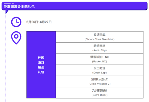 6月26日-6月27日,作为夏日最后惊喜的仲夏园游会主题礼包将作为压轴登陆平台,集合了《极速空战(Shooty Skies Overdrive)》、动感音旅、爆裂球拍:Nx、废土时速、危机行动队2、九月的晚餐等6款游戏,同时端午节及父亲节期间的捆绑包及单品秒杀也将全部返场。而在6月26日-7月5日间,平台也将针对这6款游戏特别开启仲夏园游会游戏挑战赛。