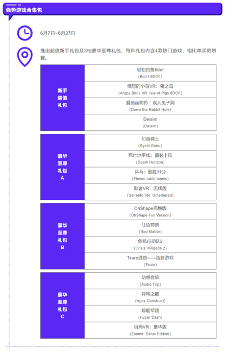 从官方已放出的大促信息详情来看,在6月7日-6月27日间,Pico Store推出超值新手礼包及3档豪华至尊礼包,每种礼包包含4款热门游戏,其中不乏《幻音骑士(Synth Riders)》、《乒乓:致胜11分(Eleven Table Tennis)》、《OhShape完整版》、《超能军团(Hyper Dash)》等目前在平台上广受好评的VR游戏大作,相比单买,购买捆绑包最高能享受约40%的折扣。