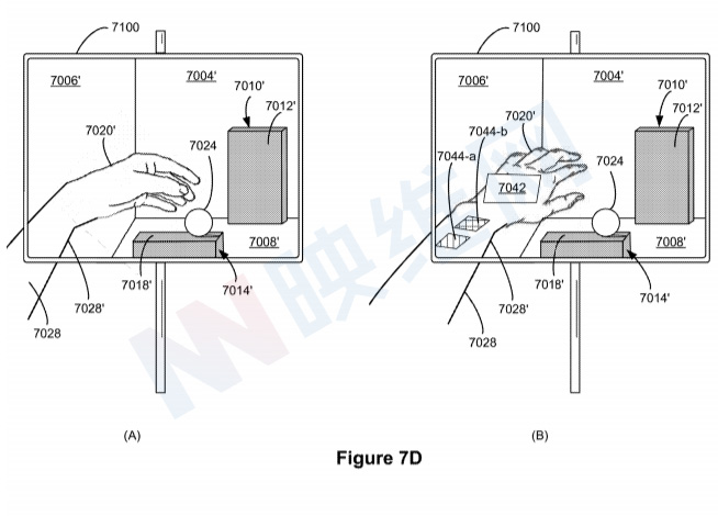 如专利图7B和专利图7D所示,计算机系统可以检测手腕/前臂的朝向,并相应地投影不同的控制界面。