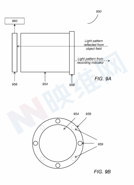 图9A和9B描述了录制指示器958,其包括围绕摄像头镜头954的光元件959的环,并以加密模式产生光脉冲。如图9A所示,由录制指示器958发射的光可以提供摄像头950正在录制视频的指示说明。如图9B所示,光元件959可以紧密地布置在摄像头镜头954周围。录制指示器958发出加密的光图案。