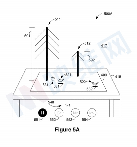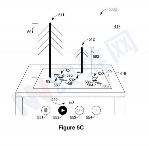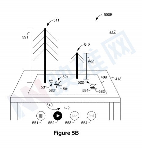 在专利图5B中,响应于用户对播放键552的选择并且在帧时间之后显示第二图像500B。在图5B中,时间指示符540指示增强现实环境409的当前时间为2。