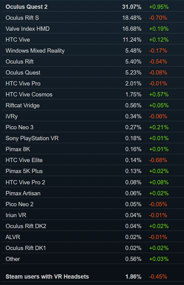 本月占比下滑0.54%,Quest 1则微跌0.08%,HTC Vive Elite则下滑0.68%,而首次纳入细分统计的Pico Neo 3则增长0.21%,本月占比0.27%。
