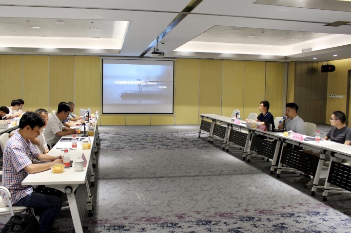 最后,双方在影创大厦会议室进行了座谈。影创科技集团副董事长胡金鑫向大家介绍了公司现有的主要产品及技术研发情况,并和师生分享了自己创业过程中的一些感悟。郑正奇老师向大家介绍了目前学院微电子学与固体电子学、信息与通信工程两个专业的概况,以及8个不同的研究团队情况,并提出了影创相关研究与学校部分研究团队具有的相似性。随后,双方进一步交流了在视觉定位、纳米压印光刻机、无线通信定位感知、微纳芯片等多个方面的研究进展和目前技术的局限性,并探讨了未来多种技术融合的多样可能性。