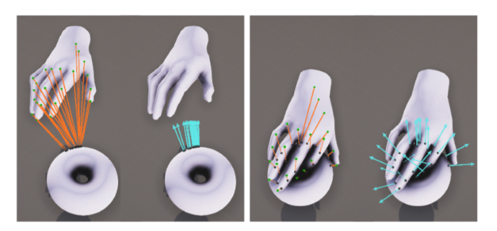 爱丁堡大学、香港大学和Facebook Reality Labs的中心思想是利用代表手部和对象空间关系的特征,并结合有关抓取的生物力学文献。早前的研究指出,总体的抓取姿势位于低维空间中,而这在很大程度上取决于任务。手部姿态的高阶变化取决于对象形状的细节。另外,随着手部越来越靠近对象,手部姿态的变化将会开始形成。所以,研究人员为全局对象形状选择一个粗略表示,但仅当手部接近时为对象表面的局部几何细节选择一个密集表示。