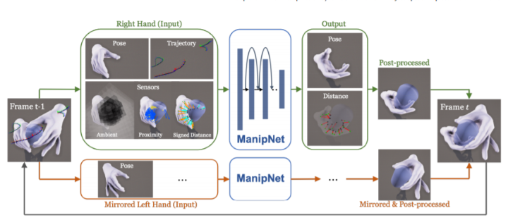 为了提高网络的通用性和避免对训练数据的过度拟合,团队提出了三种虚拟传感器来编码对象的几何结构及其与手的空间关系。所述传感器以粗体素网格的形式捕捉全局对象形状,以点样形式捕捉局部几何细节。全局特征有助于规划整体姿态和预测未来运动,而局部特征在实现对几何变化的泛化方面起着重要作用。ManipNet是一种基于剩余稠密网络结构的时间序列模型。网络的输入包括前一帧中的手姿势、传感器特征和控制信号,其中包括手腕和围绕前一帧对象的过去和未来轨迹。