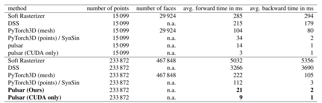 上述策略允许Pulsar通过图像形成来为消费者图形硬件渲染和微分具有数百个球体的3D场景。对于1024×1024像素的图像分辨率,它可以实时渲染和更新多达1024个球面(执行C++代码渲染的时间小于一百万毫秒,而梯度计算小于6毫秒)。