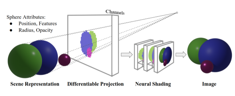 Pulsar是一个高效的、基于球体的、可微分的渲染模块。从场景表示的设计到底层数据的并行优化,其目标是通过各种措施来满足要求。首先,团队选择一个完全基于球体的三维数据表示。每个球体都由其在空间中的位置及其半径参数化。另外,每个球体具有指定的不透明度,并且可以具有任意向量作为有效载荷,例如颜色或一般隐特征向量。图像形成是基于一个体三维合成模式,从后向前聚合有效载荷以形成最终图像或屏幕空间特征图。这使得直接处理来自3D传感器的点云数据变得容易,允许在不改变拓扑的情况下优化场景表示(就像网格存在的那样),并且比基于体三维网格等最新方法更有效地实现渲染。
